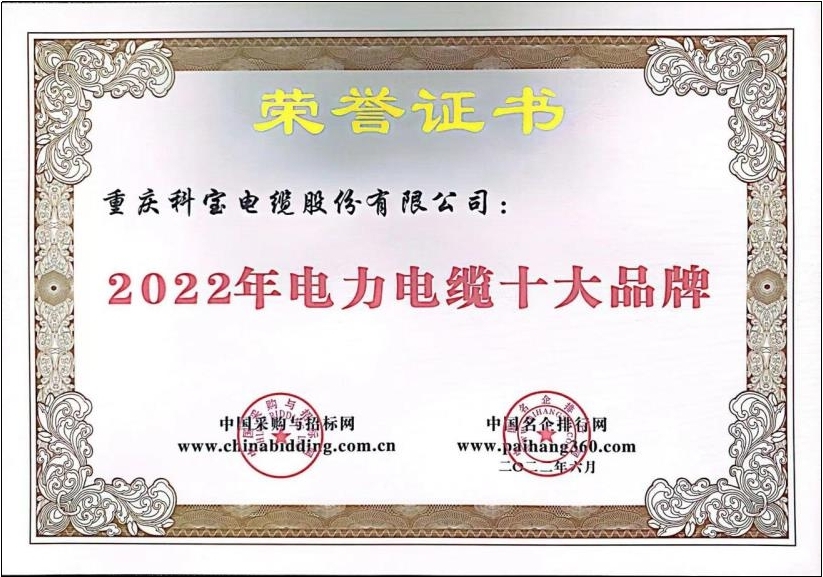 2022年电力电缆十大品牌证书