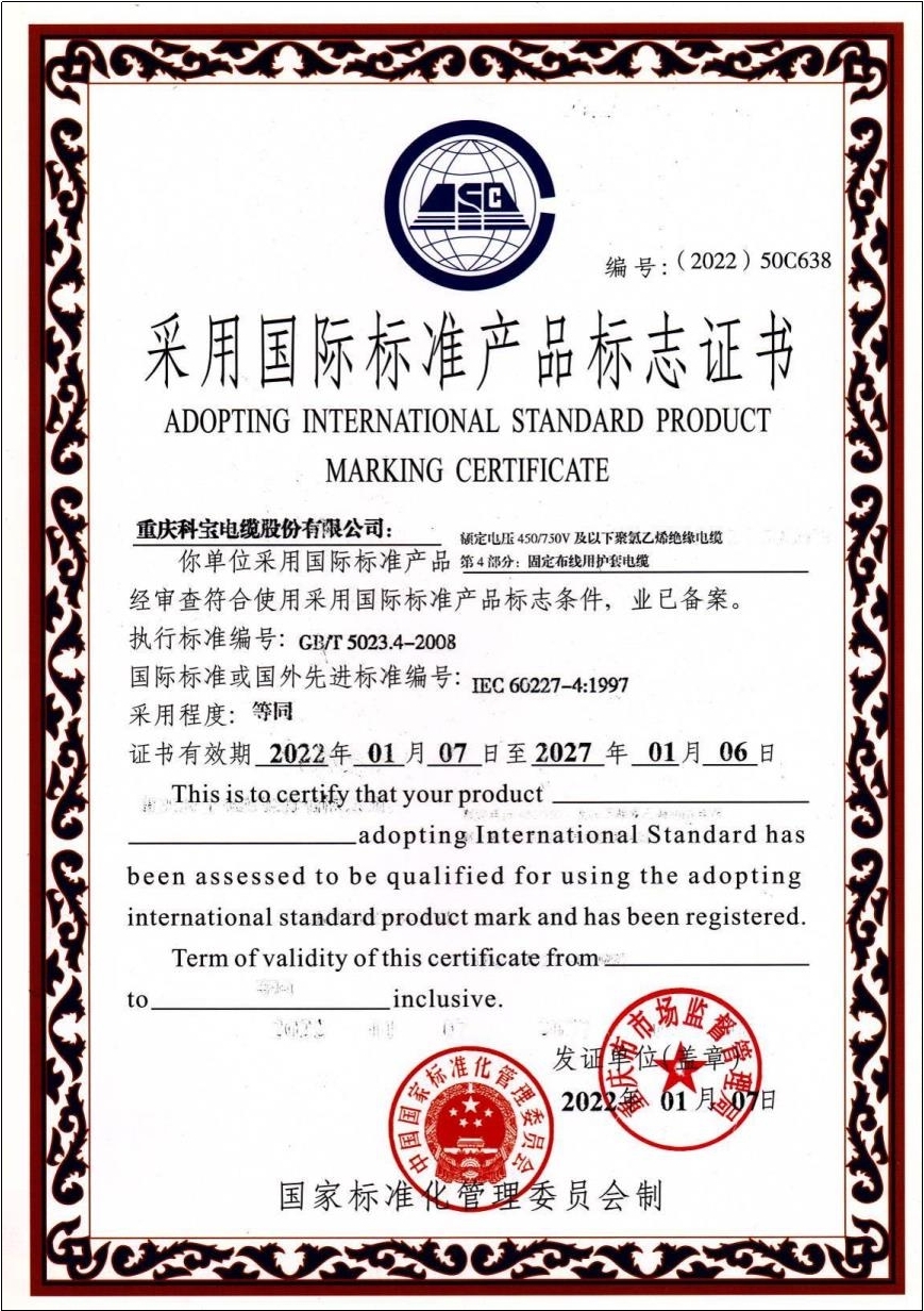 采用国际标准产品标志证书